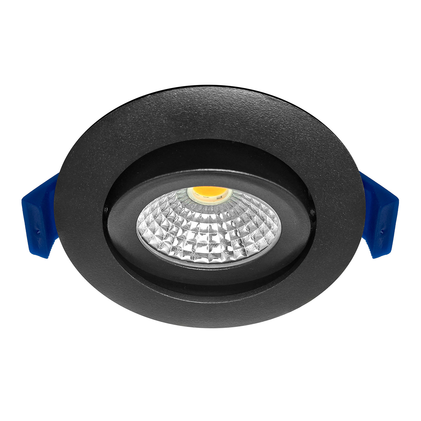 Key features of this black, round LED recessed spotlight are its IP65 value (splash-proof), its small recessed depth (23 mm) and its excellent dimmability. Unique is the compact junction box with double clamp connector, which makes it easy and safe to realise a parallel connection. Excellent dimmability with all EcoDim LED dimmers. The light colour is easy to change with the slider on the LED transformer.